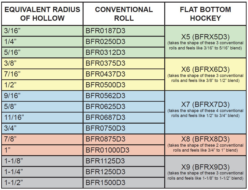 1-1/8" | BFR1125D3 | X9 (BFRX9D3) (Takes the shape of these 3 conventional rolls and feels like 1-1/8" to 1-1/2" blend) |